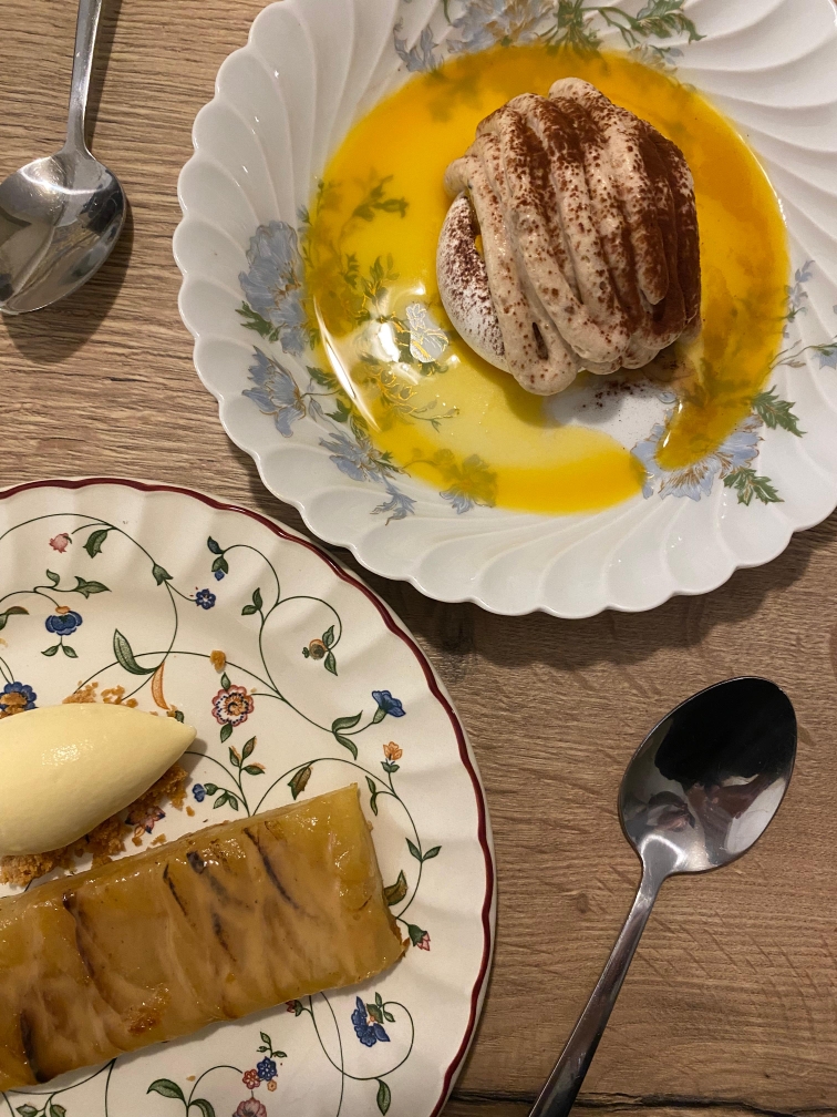 La carte du soir apporte également d’autres propositions pour les amateurs de bonne cuisine, à l’exemple d’un magret de canette, d’un filet de lieu jaune ou encore de ravioles à la pomme de terre. Mention spéciale pour la vaisselle chinée et fleurie qui apporte une touche d’originalité au service impeccable.