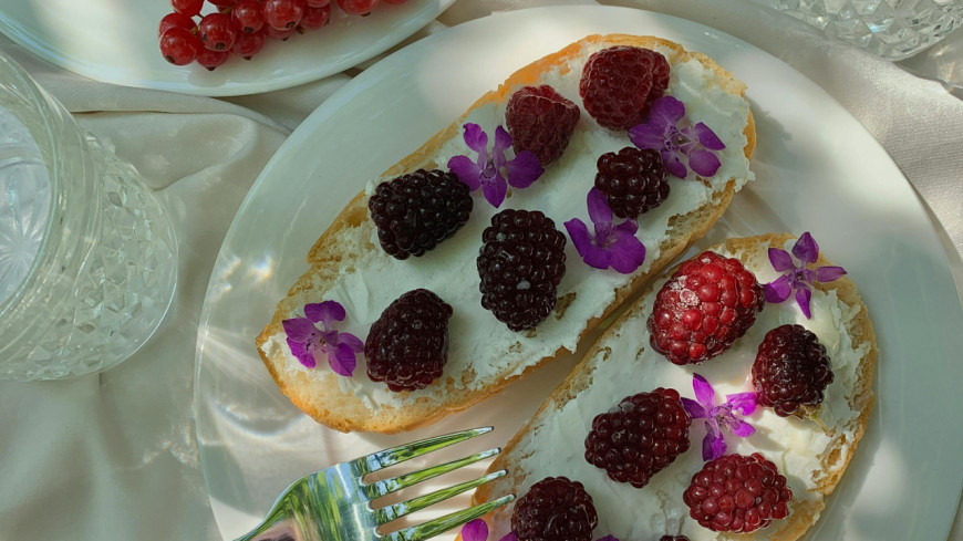 - Tartines de fromage frais garnies d’avocat, de saumon et de grenade.