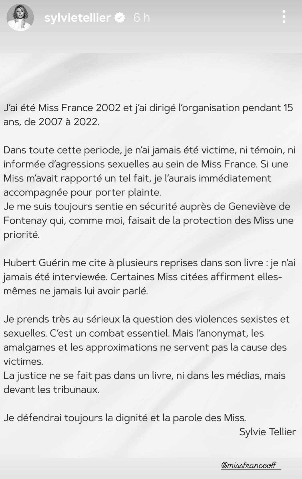 Sylvie Tellier, ex-Miss France et ancienne directrice du concours de beauté, a également tenu à prendre la parole en publiant un communiqué sur ses réseaux sociaux.