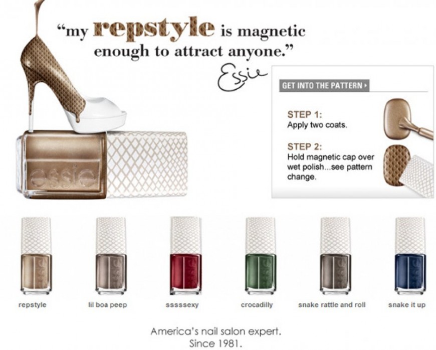 Ce printemps, Essie mise sur le vernis magnétique. Mais attention, point de dessin en rayures ou en pois : la marque a opté pour des mises en forme façon peau de reptile. Dans la pratique, on applique deux couches de vernis, puis on place l'aimant posé sur le capot du vernis au-dessus de l'ongle et les dessins apparaissent comme par magie. Reste à savoir si on assumera des ongles au dessin si venimeux.