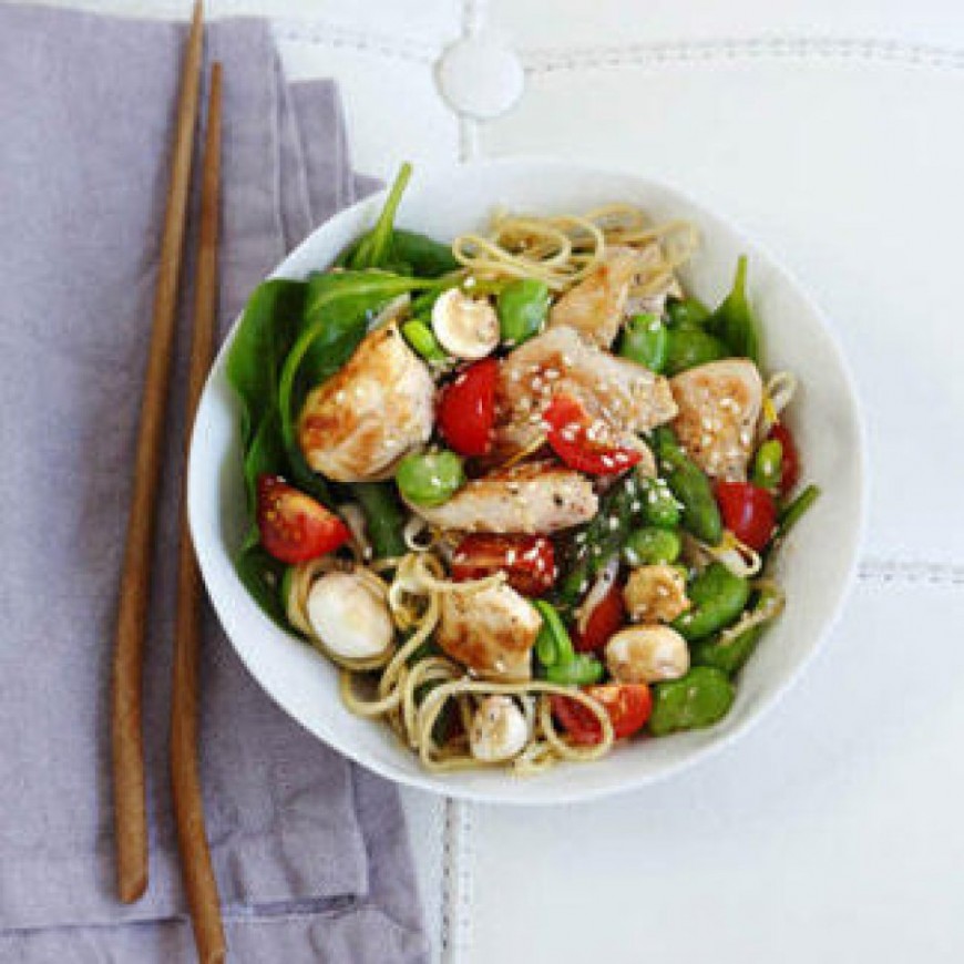 Répartir dans deux bols 50 g de pousses d’épinard, les nouilles, 30 g de pousses de soja, 30 g de mini-champignons de Paris, 100 g de fèves pelées et 12 tomates cerises coupées en quatre, puis le poulet, saler, poivrer, arroser avec 2 cuillerées à soupe d’huile de sésame et parsemer 1 cuillerée à soupe de graines de sésame.