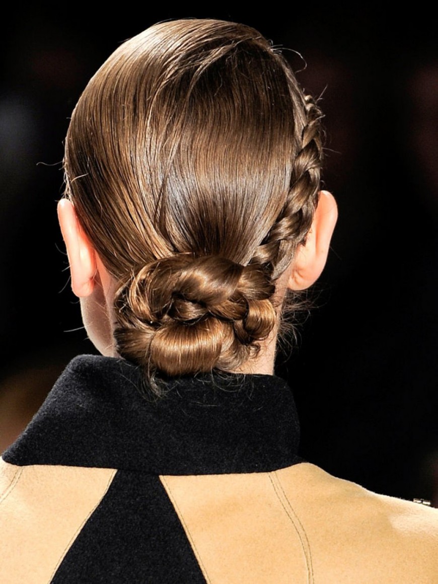 Après : ça c’était en 2012. Cette année, on donne un peu plus de piquant à cette coiffure finalement ultra basique en cassant son côté un peu trop rigide (cheveux tirés, bien plaqués, et bun tout en rondeur). L’idée : l’attacher très grossièrement en prenant soin de le décentrer légèrement, de laisser des mèches folles s’en échapper et de le nouer avec ce qui nous tombe sous la main : un foulard pour les plus classique, une chute de tissu lamé pour les plus aventurières…