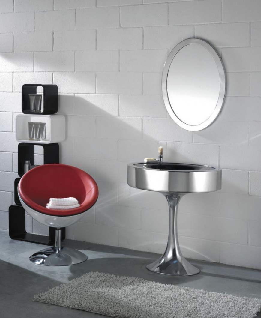 Palais de Fontana : Consolle de fonte d'aluminium. Finition en aluminium polie. Bassin en cristal. Miroir de fonte d'aluminium. Finition en aluminium polie.