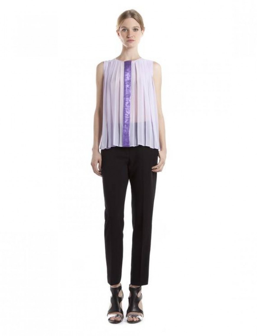 Chemisier plissé sans manches et sans col en soie, grande bande contrastée en lurex mauve cachant une patte de boutonnage.