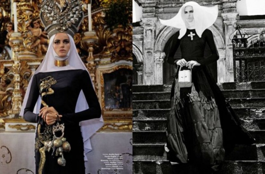 Le numéro de février du magazine Vogue Brésil propose à ses lecteurs une belle série de photos créée par Giampaolo Sgura avec le modèle Izabel Goulart visualisant une religieuse attirée par la mode.