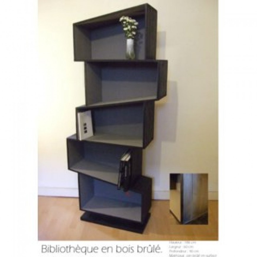 Réalisés avec la notion de l'élément "feu". Cette bibliothèque asymétrique est brûlé en surface, ce qui induit le mouvement... Les casiers de rangement ont bougé par l'impulsion de la chaleur.
