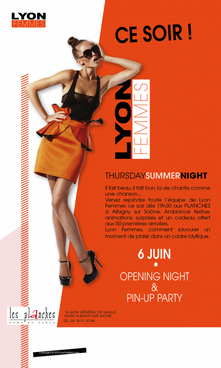 L'événement de la semaine, c'est bien sûr l'ouverture des soirées Lyon Femmes aux Planches. Elles se dérouleront à partir du 6 juin et seront présentes tous les jeudis soirs jusqu'au 25 juillet. L'occasion permettant d'échanger sur la mode, la beauté et l'actualité féminine, n'hésitez plus mesdames, sortez vos talons et venez à notre rencontre lors de ces soirées. De nombreux cadeaux et surprises vous attendent dans une ambiance conviviale et ensoleillée et les 50 premières arrivées seront récompensées.