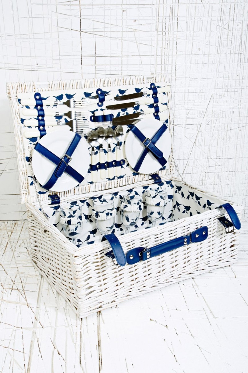 Ce panier de pique-nique signé Anorak contient tout ce qu'il vous faut pour festoyer à quatre. Le panier en osier comporte une sangle en similicuir à boucle s'ouvrant sur un compartiment principal contenant une doublure originale, des assiettes en céramique, des verres à vin, des couverts, des serviettes et un ouvre-bouteille.