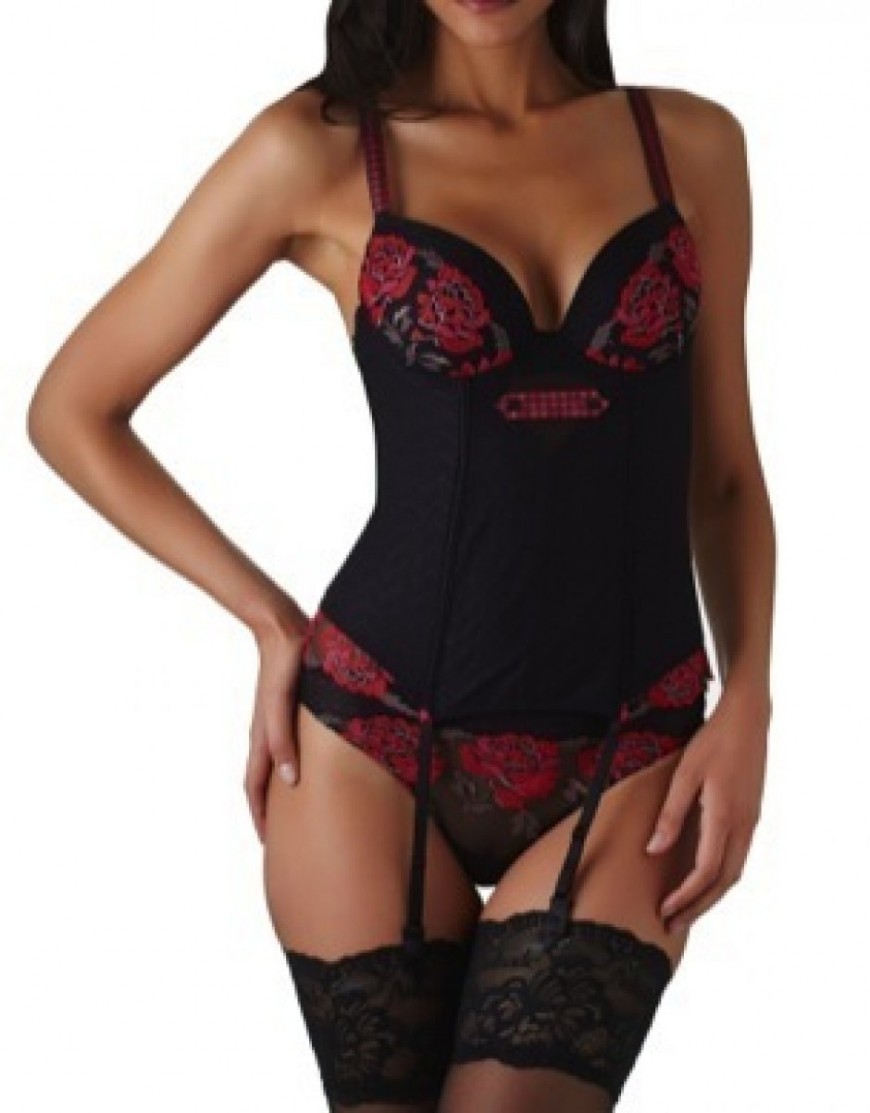 Association d'une borderie de grandes roses en trois tons et d'une maille inspirée du prêt à porter avec des effets chevrons. Une martingale imprimée pied de poule avec un petit bouton logotypé Aubade est posée sur les bas et à l'entre-seins des soutiens gorge pour un style encore plus moderne.