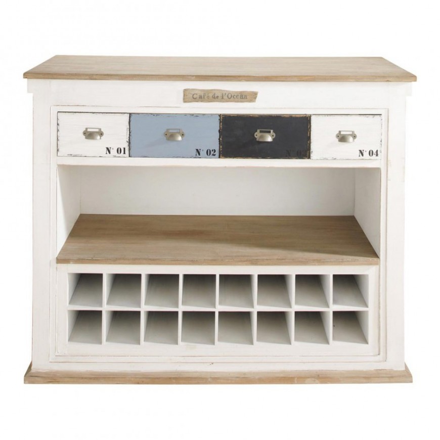 Retrouvez tout le cachet d'une pièce chinée en brocante avec le bar blanc Molène. Ce meuble de bar en bois patiné et vieilli dispose de 16 casiers range-bouteilles et de 4 tiroirs.